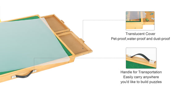 【4 DRAWERS & 1 Protective COVER】4 SLIDING DRAWERS allow you to sort your pieces by color, theme or border. Keep them categorized while assembling your puzzle.Every drawer is specially designed with a handle in order to ensure all the drawers are stay closed when transportation, safely keep the pieces from missing.Featuring a translucent cover, this puzzle board with cover can well guard your masterpiece from dust, water and your curious Pro.Cat until the next time you’d like to continue.